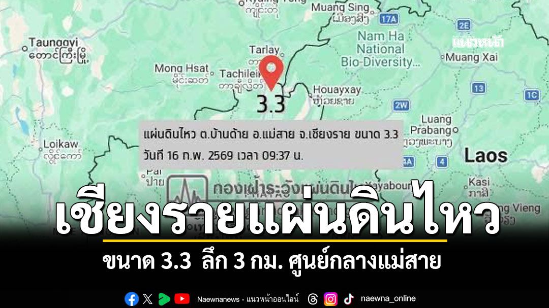 เชียงรายแผ่นดินไหวขนาด 3.3 ศูนย์กลาง ต.บ้านด้าย อ.แม่สาย ลึกเพียง 3 กม. เร่งตรวจสอบความเสียหาย