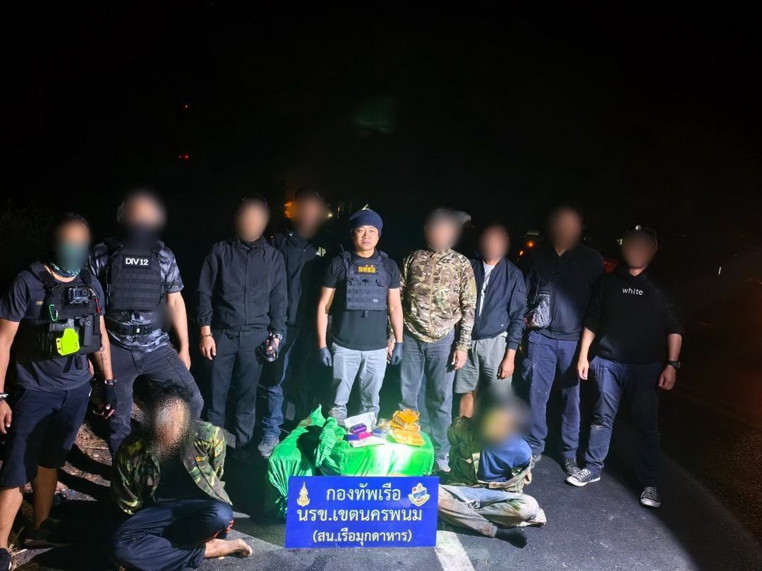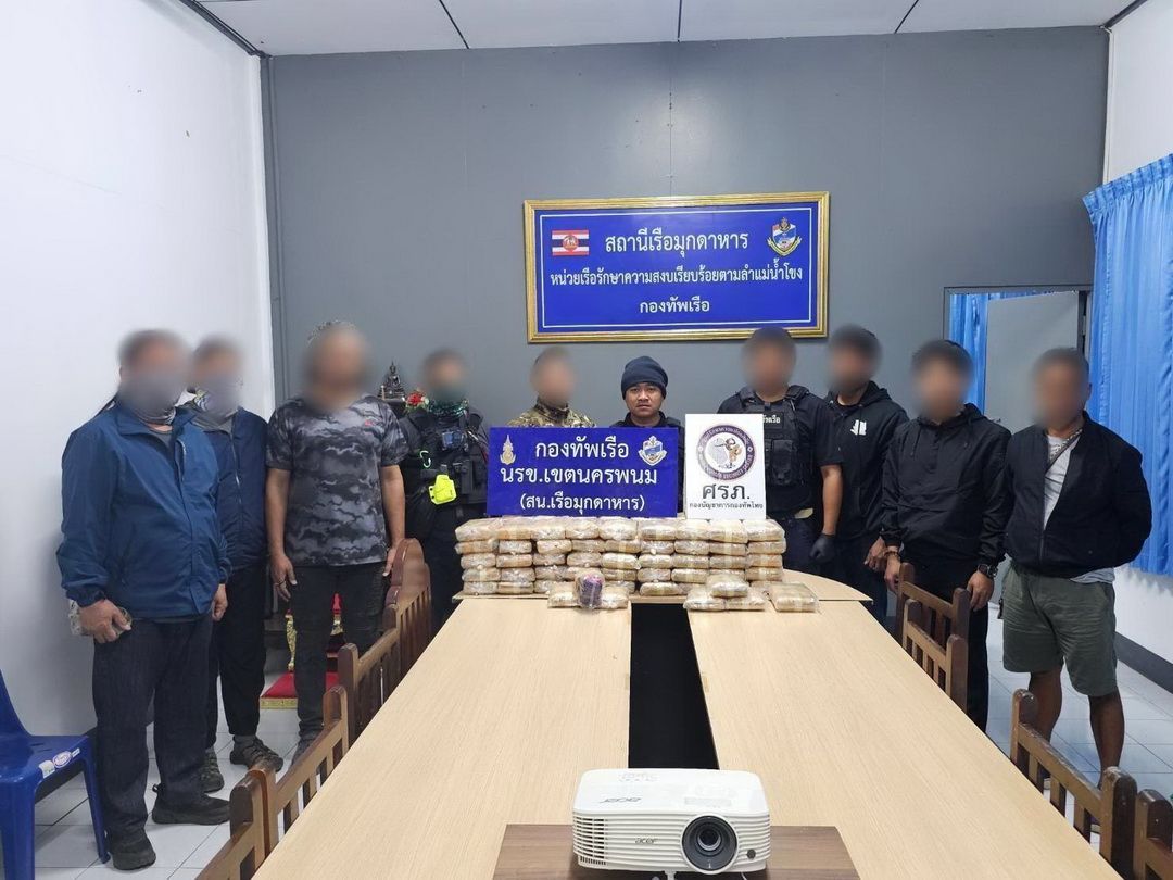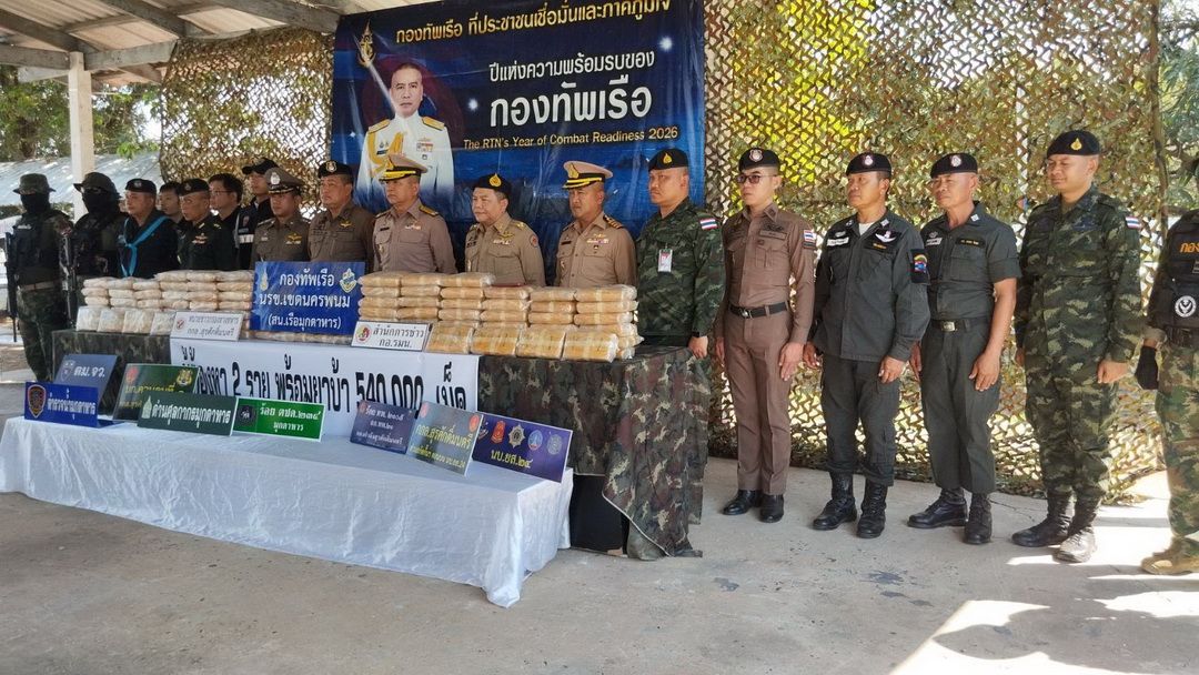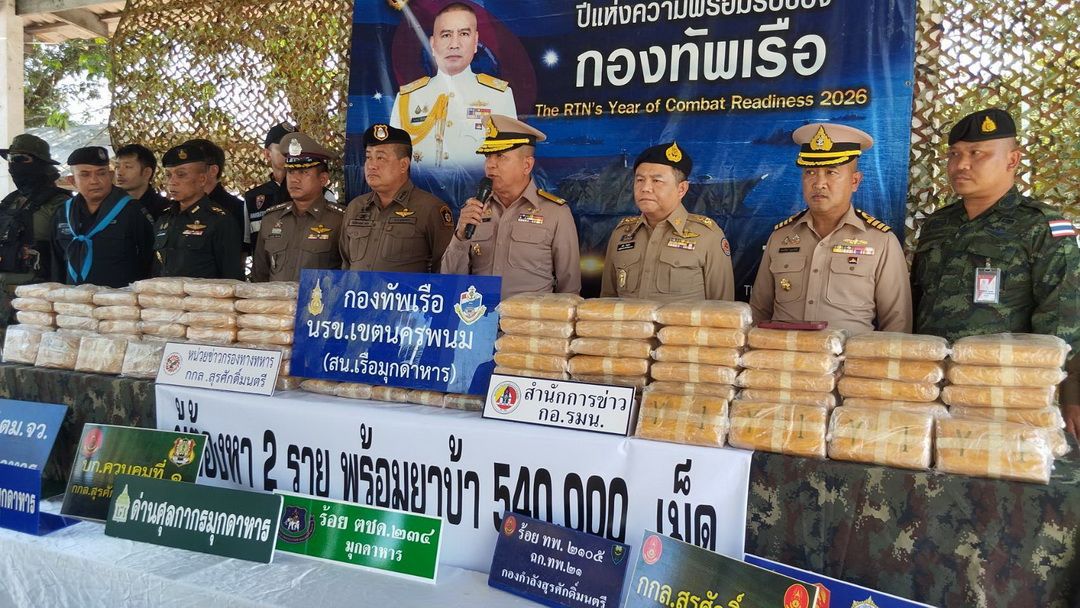 วันที่ 16 ก.พ. 69 ที่สถานีเรือมุกดาหาร พล.ร.ต.ณรงค์ เอมดี ผบ.นรข. พร้อมด้วย นายชลิต ทิตย์คำ รองผู้ว่าราชการจังหวัดมุกดาหาร และหน่วยงานความมั่นคง ร่วมกันแถลงผลการจับกุมยาเสพติดให้โทษประเภท 1 (ยาบ้า) จำนวนมหาศาลกว่า 540,000 เม็ด พร้อมผู้ต้องหาชาว สปป.ลาว 2 ราย
