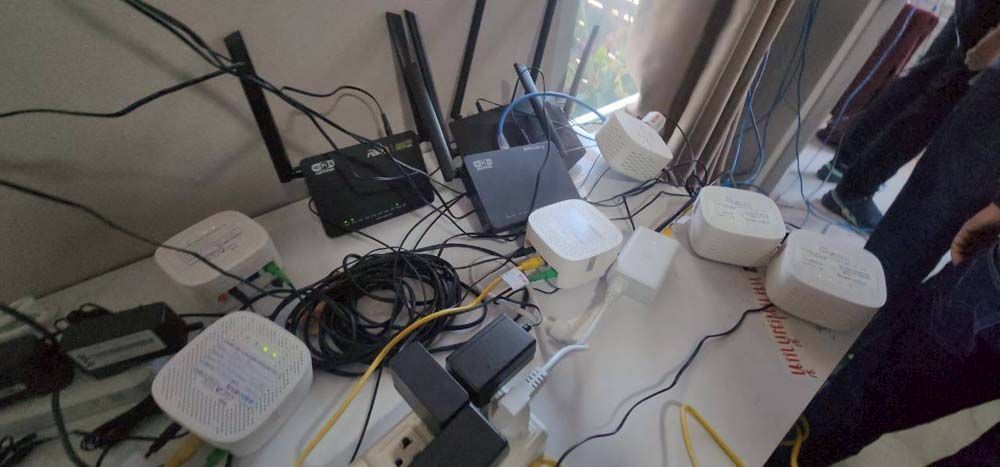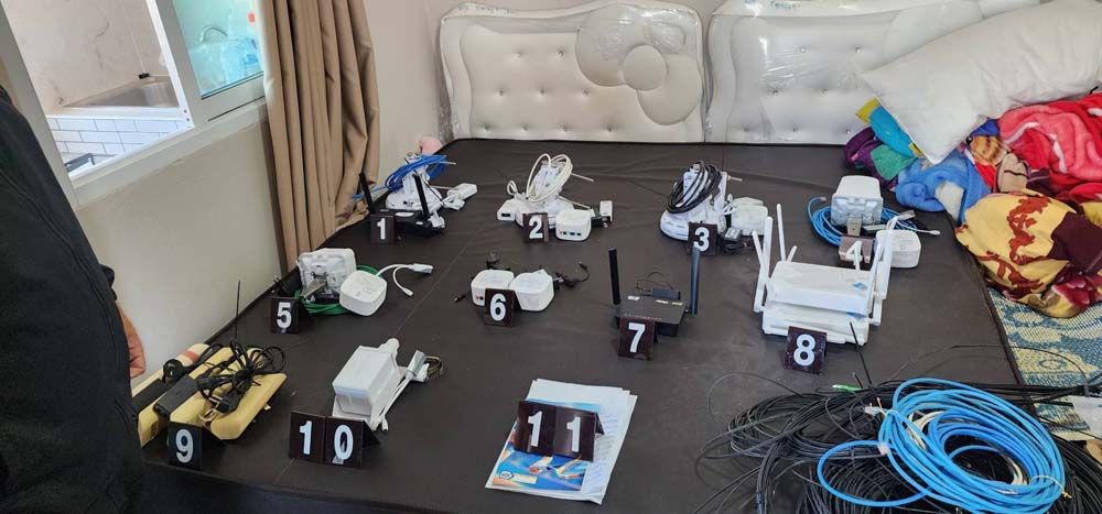 “จุดรวม–กระจายสัญญาณ” จำนวนหลายชิ้น รวมถึงการตั้งค่าระบบ VPN และอุปกรณ์เชื่อมต่อที่มีพฤติการณ์มุ่งส่งผ่านทราฟฟิกซึ่งถูกหันทิศการส่งสัญญาณไปยังประเทศเมียนมา ซึ่งจากการให้ข้อมูลของผู้เช่าห้องดังกล่าวทำให้ทราบว่า เป็นการกระทำที่เป็นกระบวนการโดยมีการจ้างให้บุคคลทำการเปิดเช่าห้องพัก