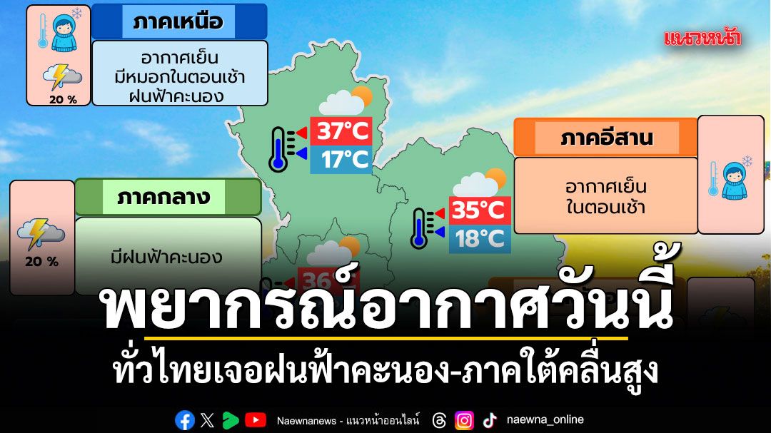 18 กุมภาพันธ์ 2569 พยากรณ์อากาศประจำวัน ลักษณะอากาศทั่วไป พยากรณ์อากาศ 24 ชั่วโมงข้างหน้า ประเทศไทยตอนบนมีฝนฟ้าคะนองบางแห่ง เนื่องจากบริเวณความกดอากาศสูงหรือมวลอากาศเย็นกำลังปานกลางจากประเทศจีนปกคลุมภาคตะวันออกเฉียงเหนือ และทะเลจีนใต้ ส่งผลทำให้มีลมตะวันออกและลมตะวันออกเฉียงใต้พัดนำความชื้นจากอ่าวไทยเข้ามาปกคลุมประเทศไทยตอนบน ขอให้ประชาชนในบริเวณดังกล่าวดูแลรักษาสุขภาพเนื่องจากสภาพอากาศที่เปลี่ยนแปลง และระวังอันตรายจากฝนฟ้าคะนองที่อาจจะเกิดขึ้นในระยะนี้ไว้ด้วย
