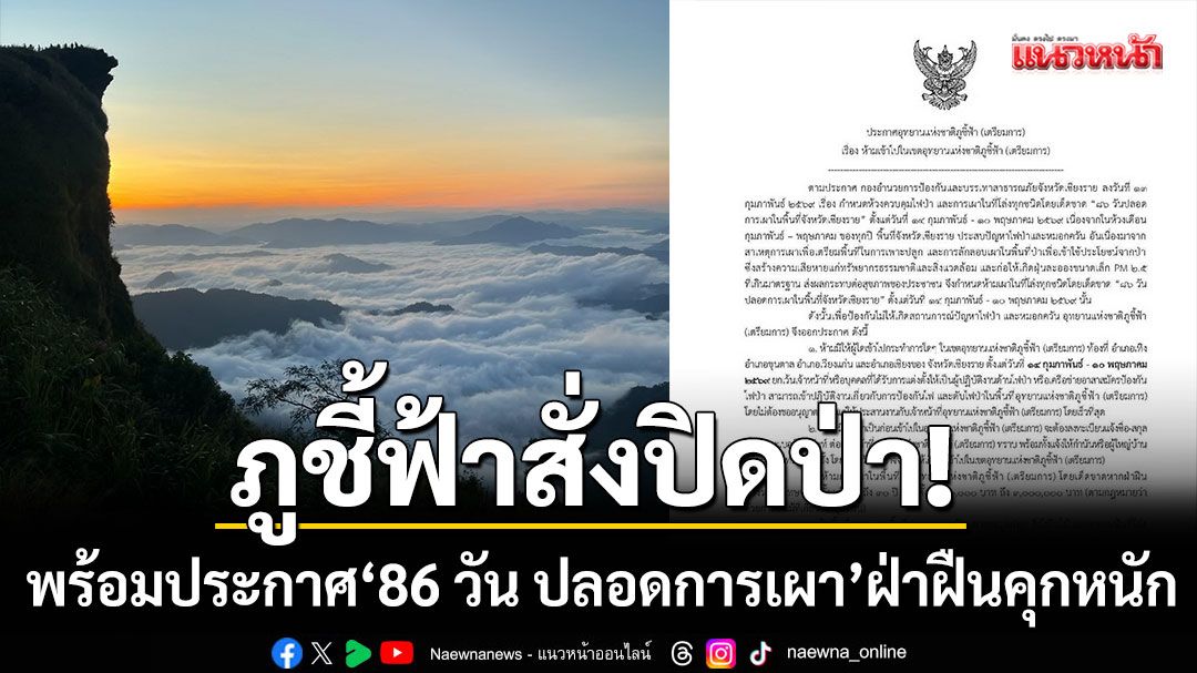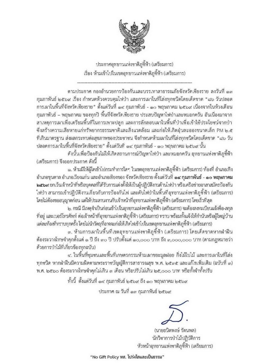 ภูชี้ฟ้าสั่งปิดป่า! ห้ามบุคคลเข้าพื้นที่โดยเด็ดขาด พร้อมประกาศ ‘86 วัน ปลอดการเผา’ ทั่วเชียงราย-ฝ่าฝืนคุกสูงสุด 30 ปี
