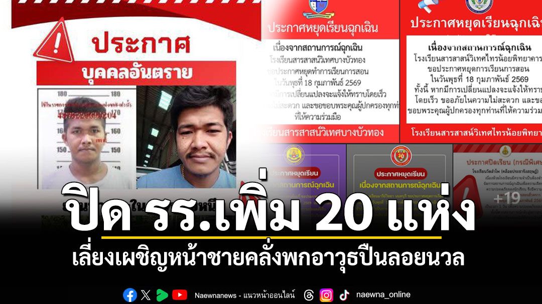 18 กุมภาพันธ์ 2569 รายงานความคืบหน้าสภานการณ์ ชายคลั่งถืออาวุธปืนในพื้นที่ อ.ลาดหลุมแก้ว จ.ปทุมธานี และรอยต่อ จ.นนทบุรี ส่งผลให้ทางโรงเรียนประกาศปิดไปแล้ว 17 แห่งเพื่อความปลอดภัย