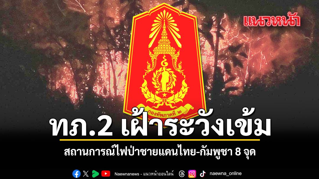 เมื่อวันที่ 19 ก.พ.69 กองทัพภาคที่ 2 ได้สรุปสถานการณ์ไฟป่าบริเวณแนวชายแดนไทย–กัมพูชา ประจำวันพบจุดเฝ้าระวังรวม 8 จุด โดยภาพรวมสถานการณ์ยังอยู่ในระดับควบคุมได้ แม้บางพื้นที่พบกลุ่มควันและไฟป่าในฝั่งประเทศกัมพูชาใกล้แนวชายแดนไทย