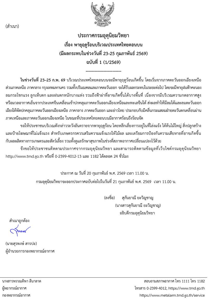 วันที่ 20 กุมภาพันธ์ 2569 กรมอุตุนิยมวิทยา ออกประกาศเตือนเรื่อง พายุฤดูร้อนบริเวณประเทศไทยตอนบน (มีผลกระทบในช่วงวันที่ 23-25 กุมภาพันธ์ 2569) ฉบับที่ 1