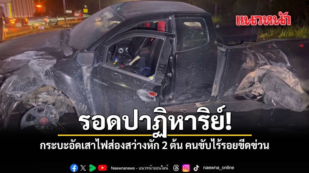 ที่เกิดเหตุพบรถกระบะสีดำจอดขวางถนน สภาพห้องเครื่องพัง ล้อฝั่งซ้ายหลุดออกจากตัวรถทั้ง 2 ล้อ สภาพรถ พังเสียหายยับเยิน ห่างไป 10 เมตร พบเสาไฟส่องสว่าง หักถอนจากฐานราก 2 ต้น ขวางถนน กู้ภัยจึงเปิดไฟวับวาบป้องกันเหตุซ้ำซ้อน