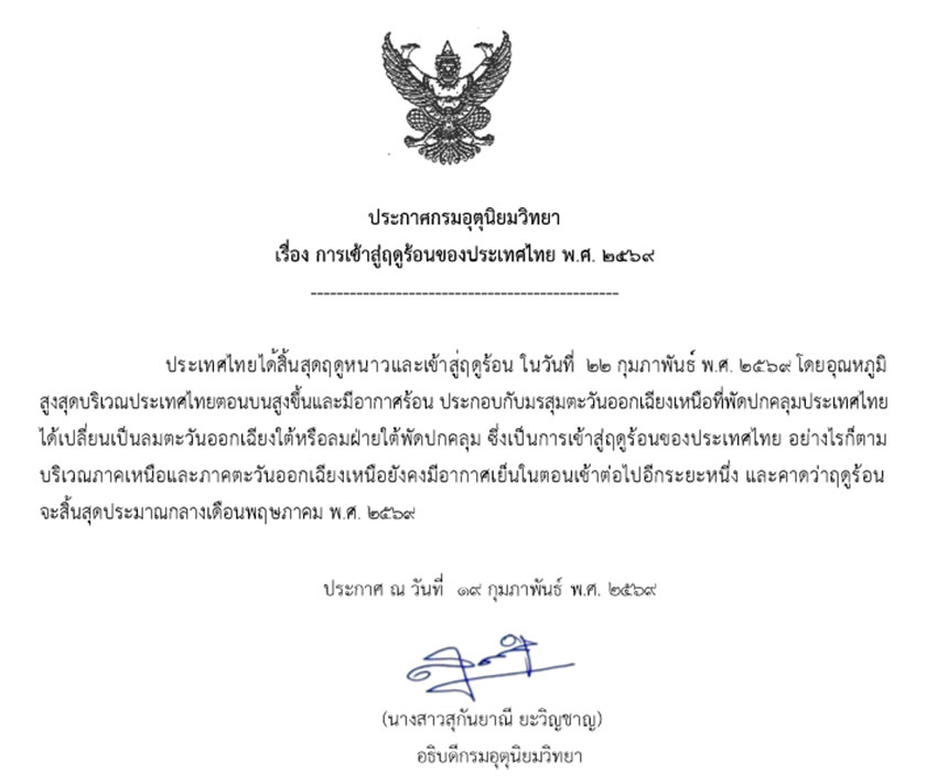 กรมอุตุนิยมวิทยา ประกาศ ประเทศไทยได้สิ้นสุดฤดูหนาวและเข้าสู่ฤดูร้อน ในวันที่ 22 กุมภาพันธ์ พ.ศ. 2569 โดยอุณหภูมิสูงสุดบริเวณประเทศไทยตอนบนสูงขึ้นและมีอากาศร้อน ประกอบกับมรสุมตะวันออกเฉียงเหนือที่พัดปกคลุมประเทศไทยได้เปลี่ยนเป็นลมตะวันออกเฉียงใต้หรือลมฝ่ายใต้พัดปกคลุม ซึ่งเป็นการเข้าสู่ฤดูร้อนของประเทศไทย อย่างไรก็ตามบริเวณภาคเหนือและภาคตะวันออกเฉียงเหนือยังคงมีอากาศเย็นในตอนเช้าต่อไปอีกระยะหนึ่ง และคาดว่าฤดูร้อนจะสิ้นสุดประมาณกลางเดือนพฤษภาคม พ.ศ. 2569