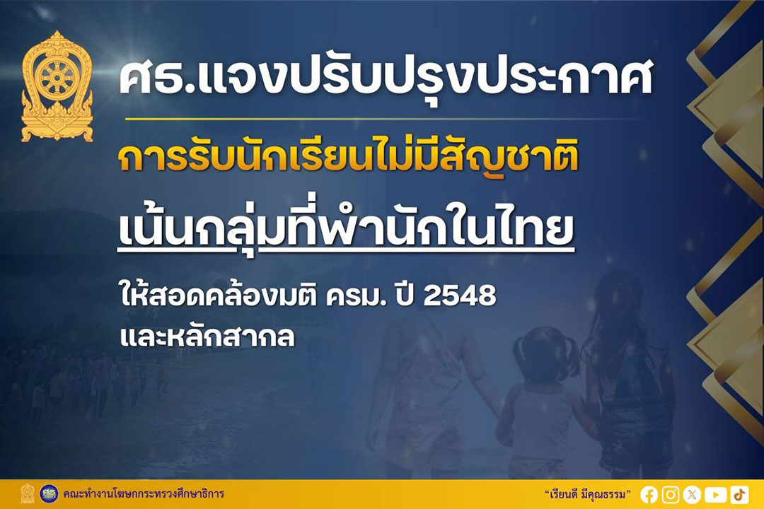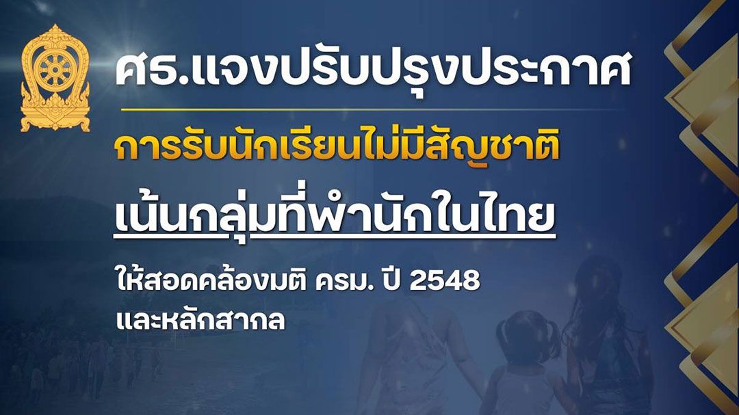 24 กุมภาพันธ์ 2569 กระทรวงศึกษาธิการ (ศธ.) แจงการปรับปรุงประกาศการรับนักเรียนไม่มีสัญชาติ ระบุว่า กระทรวงศึกษาธิการ (ศธ.) ออกประกาศฉบับใหม่ปี 2568 เรื่อง การรับนักเรียนนักศึกษาที่ไม่มีหลักฐานทะเบียนราษฎรหรือไม่มีสัญชาติไทย โดยมีการปรับปรุงสาระสำคัญด้วยการตัดข้อความเกี่ยวกับผู้ที่มีภูมิลำเนาอยู่ต่างประเทศออก เพื่อให้สอดคล้องกับมติคณะรัฐมนตรี และเน้นการจัดการศึกษาให้แก่เด็กที่พำนักอยู่ในประเทศไทย