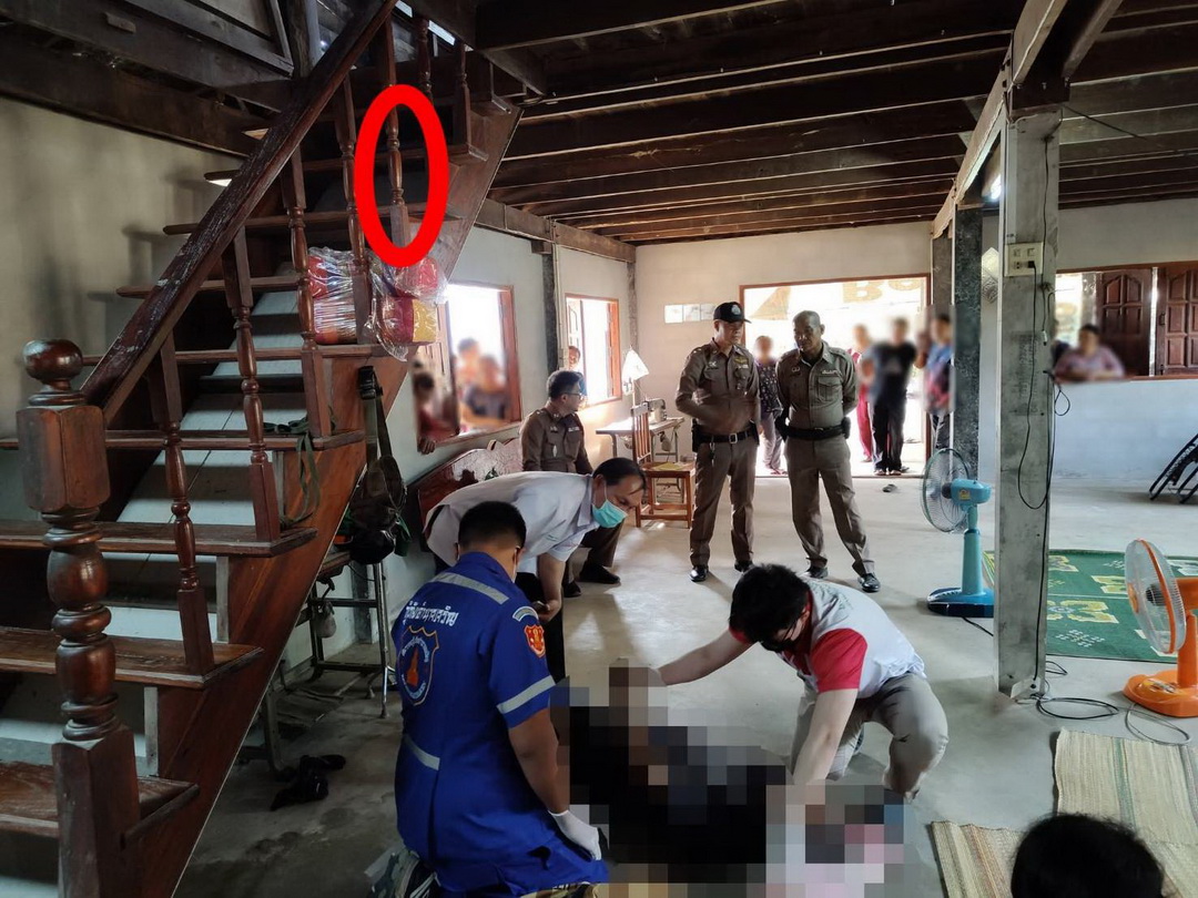 ในที่เกิดเหตุเป็นบ้าน 2 ชั้น บริเวณพื้นบ้านชั้นล่างพบศพ นายชิน อายุ 58 ปี เจ้าของบ้าน สภาพเสียชีวิตมาแล้วหลายชั่วโมง โดยมีญาติพี่น้องนั่งร้องไห้เสียใจอยู่ข้างกาย บริเวณราวบันไดชั้นที่ 4 พบเชือกที่ใช้ก่อเหตุยังผูกติดอยู่ ตรวจสอบเบื้องต้นไม่พบร่องรอยการต่อสู้หรือบาดแผลจากการถูกทำร้าย แพทย์ระบุเสียชีวิตจากการขาดอากาศหายใจ