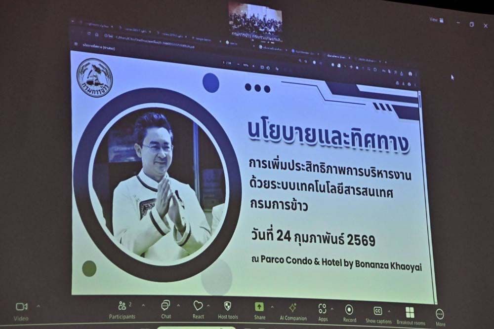 24 กุมภาพันธ์ 2569 นายอานนท์ นนทรีย์ อธิบดีกรมการข้าว เป็นประธานเปิดโครงการฝึกอบรม “การเพิ่มประสิทธิภาพการบริหารงานด้วยระบบเทคโนโลยีสารสนเทศ กรมการข้าว” โดยมีผู้บริหารทั้งส่วนกลางและส่วนภูมิภาค รวมถึงเจ้าหน้าที่กรมการข้าวเข้าร่วม ณ โรงแรม พาโค่ เขาใหญ่ บาย โบนันซ่า จังหวัดนครราชสีมา