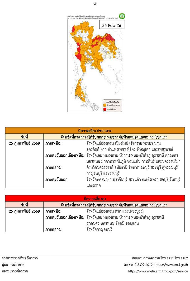 วันที่ 25 กุมภาพันธ์ 2569 กรมอุตุนิยมวิทยา ประกาศ เรื่อง พายุฤดูร้อนบริเวณประเทศไทยตอนบน (มีผลกระทบจนถึงวันที่ 25 กุมภาพันธ์ 2569) ฉบับที่ 6 (6/2569)