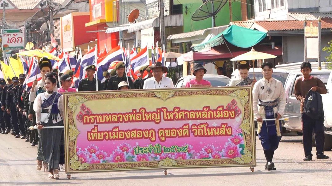 มีการประกอบพิธีพราหมณ์เพื่อความเป็นสิริมงคล จากนั้น นางรำกว่า 1,500 ชีวิต สวมใส่ชุดผ้าไทยสวยงามพร้อมเพรียง ร่วมกันรำบวงสรวงศาลหลักเมือง ด้วยท่วงท่าที่อ่อนช้อยและงดงาม แสดงออกถึงความสามัคคีของชาวโนนสัง มีการมอบรางวัลทรงคุณค่า ได้แก่ รางวัลการประกวดขบวนแห่ของดีวิถีโนนสัง และรางวัลการประกวดหุ่นฟางส่งเสริมการท่องเที่ยว เพื่อเป็นการเชิดชูเกียรติและส่งเสริมการท่องเที่ยวในพื้นที่ ทั้งนี้ งาน “กราบหลวงพ่อใหญ่ ไหว้ศาลหลักเมือง เที่ยวเมืองสองภู ดูของดีวิถีโนนสัง” ถือเป็นงานประเพณีที่จัดขึ้นต่อเนื่องเป็นประจำทุกปี เพื่อสืบสานวัฒนธรรมประเพณีอันดีงาม ส่งเสริมการท่องเที่ยว และประชาสัมพันธ์ของดีอำเภอโนนสัง ให้เป็นที่รู้จักอย่างแพร่หลาย สมกับคำขวัญเมืองสองภู (ภูเก้า-ภูพาน) ที่อุดมสมบูรณ์และน่าอยู่ และจะมีการจัดแสดงและจำหน่ายสินค้าต่อเนื่องไปตลอดช่วงการจัดงานระหว่างวันที่ 24 – 28 กุมภาพันธ์ 2569 นี้