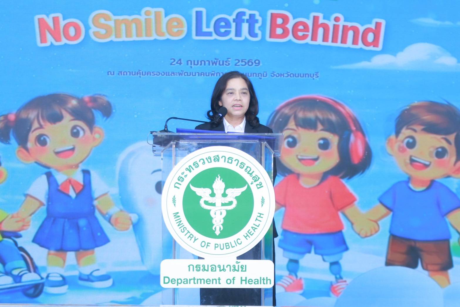 ด้าน คุณเบญจมาส แก่นเมือง รองอธิบดีกรมส่งเสริมและพัฒนาคุณภาพชีวิตคนพิการ กล่าวว่า สถานคุ้มครองและพัฒนาคนพิการ เป็นหน่วยงานที่มุ่งเน้นการพัฒนาคุณภาพชีวิตคนพิการและเด็กที่มีความต้องการพิเศษอย่างรอบด้าน ทั้งด้านสุขภาพ การศึกษา สังคม และการดำรงชีวิตอย่างมีศักดิ์ศรี การจัดกิจกรรมในวันนี้ นับเป็นจุดเริ่มต้น ในการส่งเสริมให้คนพิการและกลุ่มเปราะบาง ได้รับโอกาสในการเข้าถึงบริการสุขภาพช่องปากอย่างเท่าเทียม ขอขอบคุณ กรมอนามัย กระทรวงสาธารณสุข สำนักงานหลักประกันสุขภาพแห่งชาติ บริษัทคอลเกต - ปาล์มโอลีฟ (ประเทศไทย) จำกัด คณะทันตแพทยศาสตร์ มหาวิทยาลัยศรีนครินทรวิโรฒ จุฬาลงกรณ์มหาวิทยาลัย และมหาวิทยาลัยมหิดล มูลนิธิทันตนวัตกรรม หน่วยทันตกรรมอาสาตามรอยพ่อ ศูนย์การแพทย์ปัญญานันทภิกขุ ตลอดจนหน่วยงานที่เกี่ยวข้อง ที่ได้เล็งเห็นความสำคัญของการดูแลสุขภาพช่องปากในเด็กพิการและกลุ่มเปราะบางซึ่งเป็นกลุ่มที่ยังประสบข้อจำกัดในการเข้าถึงบริการทันตกรรม