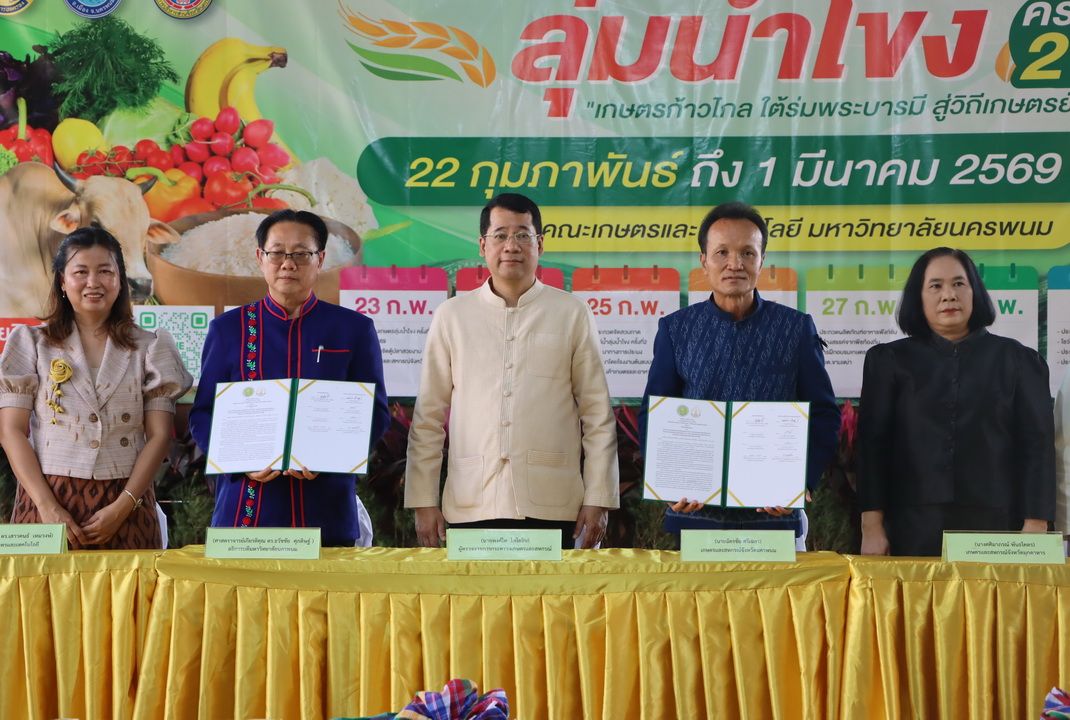 คณะเกษตรและเทคโนโลยี มหาวิทยาลัยนครพนม จัดพิธีเปิดงาน “เกษตรลุ่มน้ำโขง ครั้งที่ 27” ประจำปี 2569 ภายใต้แนวคิด “เกษตรก้าวไกล ใต้ร่มพระบารมี สู่วิถีเกษตรยั่งยืน” โดยได้รับเกียรติจาก ดร.พงศ์ไท ไทโยธิน ผู้ตรวจราชการกระทรวงเกษตรและสหกรณ์ เป็นประธานในพิธี โดยมี ว่าที่พันตรี อดิศักดิ์ น้อยสุวรรณ ผู้ว่าราชการจังหวัดนครพนม พร้อมด้วย ศ.(เกียรติคุณ)ดร.ธวัชชัย ศุภดิษฐ์ อธิการบดีมหาวิทยาลัยนครพนม และ ผศ.ดร.เสาวคนธ์ เหมวงษ์ คณบดีคณะเกษตรและเทคโนโลยี เข้าร่วมงาน ณ คณะเกษตรและเทคโนโลยี มหาวิทยาลัยนครพนม