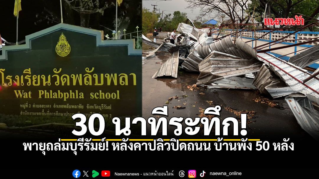 เกิดพายุฤดูร้อนพัดถล่มแค่ 30 นาที ทำให้หลังคาโรงจอดรถโรงเรียนวัดพลับพลา อ.พลับพลาชัย จ.บุรีรัมย์ ทั้งแถบปลิวลอยข้ามรั้วโรงเรียน มากองกีดขวางบนถนนเข้าออกหมู่บ้าน คณะครู เจ้าหน้าที่ และผู้นำชุมชน ต้องช่วยกันเคลื่อนย้ายกลางดึก โดยใช้เวลานานกว่า 3 ชั่วโมง จึงสามารถเปิดทางให้รถสัญจรไปมาได้ตามปกติ ขณะเดียวกันพบว่าอาคารเรียนเสียหายหลายหลัง รวมถึงบ้านเรือนประชาชน พังเสียหายไม่ต่ำกว่า 50 หลังคาเรือน