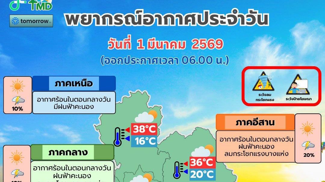 เมื่อวันที่ 1มี.ค.2569 กรมอุตุนิยมวิทยา พยากรณ์อากาศ 24 ชั่วโมงข้างหน้า ประเทศไทยตอนบนมีอากาศร้อนในตอนกลางวัน โดยมีฝนฟ้าคะนองและลมกระโชกแรงเกิดขึ้นได้บางพื้นที่บริเวณภาคกลางตอนล่าง รวมทั้งกรุงเทพมหานคร ภาคตะวันออกและภาคตะวันออกเฉียงเหนือ เนื่องจากมีลมใต้และลมตะวันตกเฉียงใต้พัดนำความชื้นเข้ามาปกคลุมบริเวณดังกล่าว ในขณะที่มีความกดอากาศต่ำเนื่องจากความร้อนปกคลุมประเทศไทยตอนบน ขอให้ประชาชนบริเวณดังกล่าวระวังอันตรายจากฝนฟ้าคะนองและลมกระโชกแรงที่จะเกิดขึ้น โดยหลีกเลี่ยงการอยู่ในที่โล่งแจ้ง ใต้ต้นไม้ใหญ่ สิ่งปลูกสร้าง และป้ายโฆษณาที่ไม่แข็งแรง รวมทั้งดูแลรักษาสุขภาพเนื่องจากสภาพอากาศที่เปลี่ยนแปลงไว้ด้วย สำหรับภาคใต้มีฝนฟ้าคะนองบางพื้นที่ เนื่องจากลมตะวันตกพัดปกคลุมทะเลอันดามัน ภาคใต้ และอ่าวไทย ส่วนบริเวณอ่าวไทยทะเลมีคลื่นสูงประมาณ1เมตร บริเวณที่มีฝนฟ้าคะนองคลื่นสูงมากกว่า 2 เมตร ขอให้ชาวเรือบริเวณอ่าวไทยและทะเลอันดามันเดินเรือด้วยความระมัดระวัง และหลีกเลี่ยงการเดินเรือในบริเวณที่มีฝนฟ้าคะนองไว้ด้วย