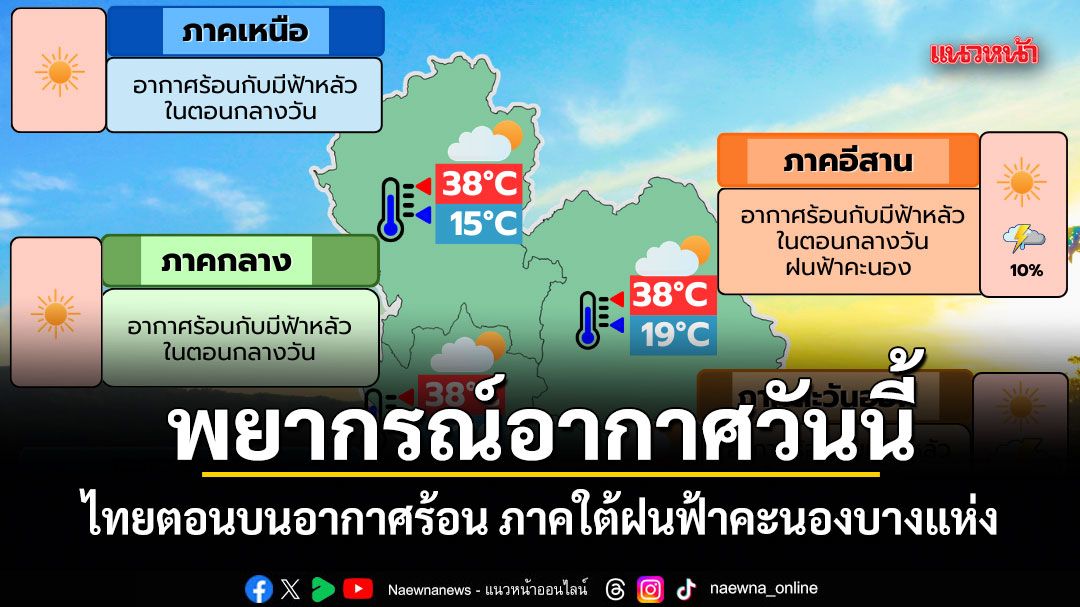 2 มีนาคม 2569 พยากรณ์อากาศประจำวัน ลักษณะอากาศทั่วไป พยากรณ์อากาศ 24 ชั่วโมงข้างหน้า ประเทศไทยตอนบนมีอากาศร้อนกับมีฟ้าหลัวในตอนกลางวัน โดยมีฝนฟ้าคะนองเกิดขึ้นได้บางพื้นที่ ในภาคตะวันออกเฉียงเหนือ และภาคตะวันออก เนื่องจากความกดอากาศต่ำเนื่องจากความร้อนปกคลุมประเทศไทยตอนบน ในขณะที่ลมตะวันตกเฉียงใต้และลมใต้ยังคงพัดปกคลุมในบริเวณดังกล่าว ขอให้ประชาชนบริเวณประเทศไทยตอนบนดูแลรักษาสุขภาพเนื่องจากสภาพอากาศที่ร้อน และระวังอันตรายจากฝนฟ้าคะนอง