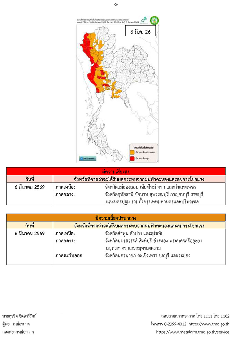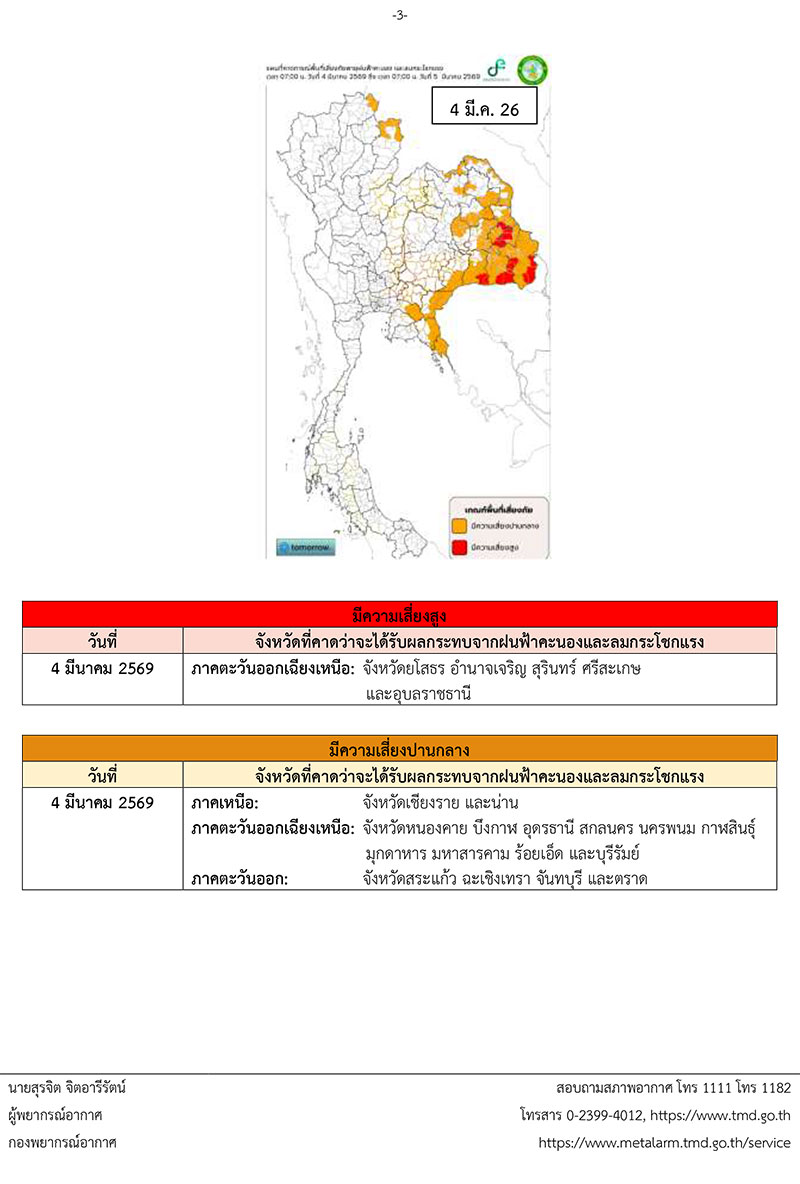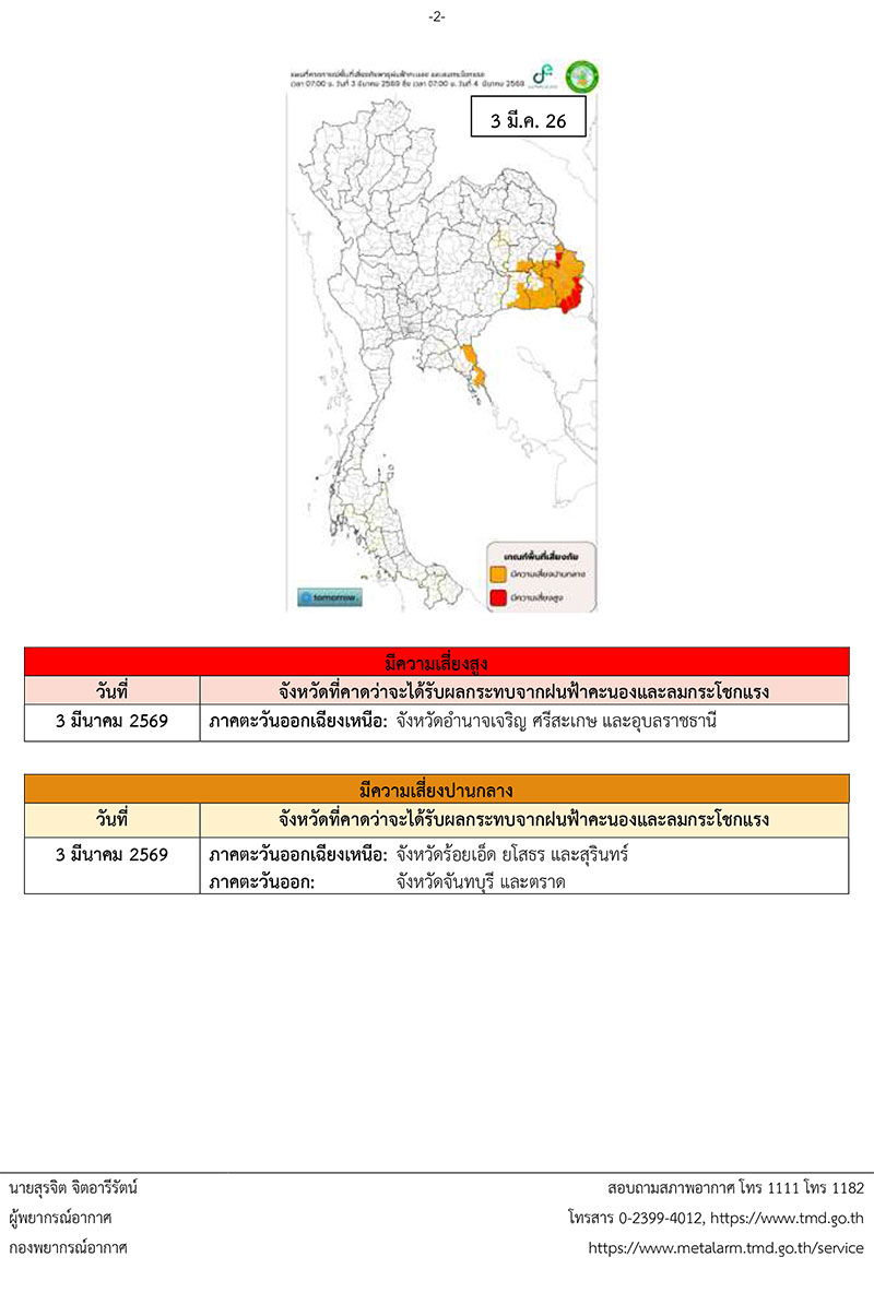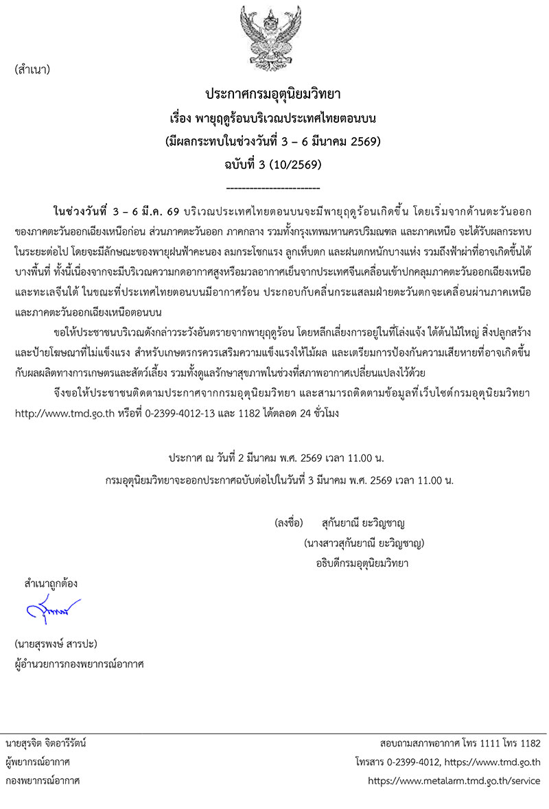 เมื่อเวลา 11.00 น. วันที่ 2 มีนาคม 2569 กรมอุตุนิยมวิทยา ประกาศกรมอุตุนิยมวิทยา เรื่อง พายุฤดูร้อน บริเวณประเทศไทยตอนบน (มีผลกระทบในช่วงวันที่ 3–6 มีนาคม 2569) ฉบับที่ 3 (10/2569)