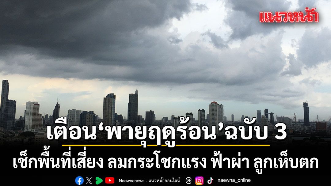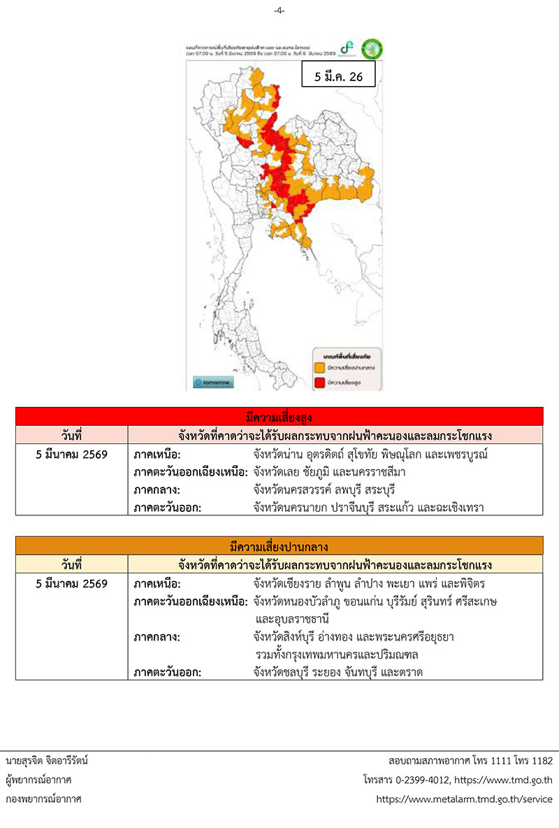 ในช่วงวันที่ 3 – 6 มี.ค. 69 บริเวณประเทศไทยตอนบนจะมีพายุฤดูร้อนเกิดขึ้น โดยเริ่มจากด้านตะวันออก ของภาคตะวันออกเฉียงเหนือก่อน ส่วนภาคตะวันออก ภาคกลาง รวมทั้งกรุงเทพมหานครปริมณฑล และภาคเหนือ จะได้รับผลกระทบ ในระยะต่อไป โดยจะมีลักษณะของพายุฝนฟ้าคะนอง ลมกระโชกแรง ลูกเห็บตก และฝนตกหนักบางแห่ง รวมถึงฟ้าผ่าที่อาจเกิดขึ้นได้บางพื้นที่ ทั้งนี้เนื่องจากจะมีบริเวณความกดอากาศสูงหรือมวลอากาศเย็นจากประเทศจีนเคลื่อนเข้าปกคลุมภาคตะวันออกเฉียงเหนือและทะเลจีนใต้ ในขณะที่ประเทศไทยตอนบนมีอากาศร้อน ประกอบกับคลื่นกระแสลมฝ่ายตะวันตกจะเคลื่อนผ่านภาคเหนือและภาคตะวันออกเฉียงเหนือตอนบน