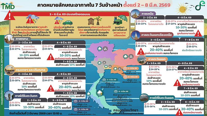 กรุงเทพและปริมณฑล ในช่วงวันที่ 2 – 3 มี.ค. 69 มีอากาศร้อนในตอนกลางวัน โดยมีฝนฟ้าคะนองร้อยละ 10 ของพื้นที่ กับมีลมกระโชกแรงบางแห่งอุณหภูมิต่ำสุด 25 – 28 องศาเซลเซียส อุณหภูมิสูงสุด 34 – 37 องศาเซลเซียสลมตะวันตก ความเร็ว 10 – 15 กม./ชม.ส่วนในช่วงวันที่ 4 – 6 มี.ค. 69 อากาศร้อนในตอนกลางวัน โดยมีพายุฝนฟ้าคะนองร้อยละ 20 – 40 ของพื้นที่ และมีลมกระโชกแรง และลูกเห็บตกบางแห่งหลังจากนั้นในช่วงวันที่ 7 – 8 มี.ค. 69 มีฝนฟ้าคะนองร้อยละ 10 ของพื้นที่อุณหภูมิต่ำสุด 24 – 27 องศาเซลเซียส อุณหภูมิสูงสุด 32 – 35 องศาเซลเซียสลมตะวันออกเฉียงใต้ ความเร็ว 10 – 25 กม./ชม.