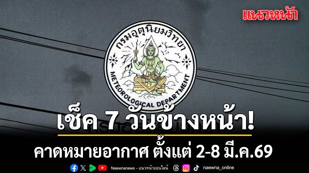 เมื่อเวลา 12.00 น. วันที่ 2 มีนาคม 2569 กรมอุตุนิยมวิทยา คาดหมายอากาศทั่วไป พยากรณ์อากาศ 7 วันข้างหน้า ระหว่างวันที่ 2 มีนาคม - 8 มีนาคม 2569 ดังนี้