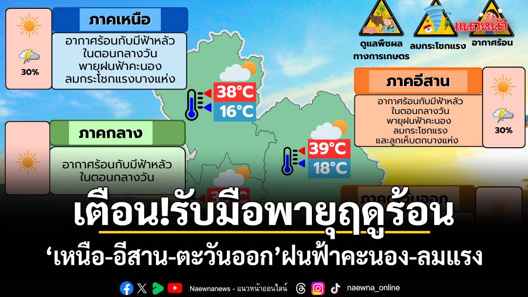 4 มีนาคม 2569 พยากรณ์อากาศประจำวัน ลักษณะอากาศทั่วไป พยากรณ์อากาศ 24 ชั่วโมงข้างหน้า ภาคเหนือด้านตะวันออก ภาคตะวันออกเฉียงเหนือ และภาคตะวันออกจะมีพายุฤดูร้อนเกิดขึ้น โดยมีลักษณะของพายุฝนฟ้าคะนอง ลมกระโชกแรง รวมถึงฟ้าผ่าที่อาจเกิดขึ้นได้บางพื้นที่ ทั้งนี้เนื่องจากบริเวณความกดอากาศสูงหรือมวลอากาศเย็นจากประเทศจีนแผ่ปกคลุมประเทศลาวตอนบน และประเทศเวียดนามตอนบนแล้ว คาดว่าจะเคลื่อนเข้าปกคลุมภาคตะวันออกเฉียงเหนือและทะเลจีนใต้ในวันนี้ (4 มี.ค. 69) ส่งผลทำให้มีลมใต้และลมตะวันออกเฉียงใต้พัดนำความชื้นจากทะเลจีนใต้เข้าปกคลุมภาคตะวันออกเฉียงเหนือ ภาคตะวันออก และอ่าวไทยตอนบน ในขณะที่ประเทศไทยตอนบนมีอากาศร้อน ขอให้ประชาชนบริเวณดังกล่าวระวังอันตรายจากพายุฤดูร้อน โดยหลีกเลี่ยงการอยู่ในที่โล่งแจ้งใต้ต้นไม้ใหญ่ สิ่งปลูกสร้าง และป้ายโฆษณาที่ไม่แข็งแรง สำหรับเกษตรกรควรเสริมความแข็งแรงให้ไม้ผล และเตรียมการป้องกันความเสียหายที่อาจเกิดขึ้นกับผลผลิตทางการเกษตรและสัตว์เลี้ยง รวมทั้งดูแลรักษาสุขภาพในช่วงที่สภาพอากาศร้อนไว้ด้วย