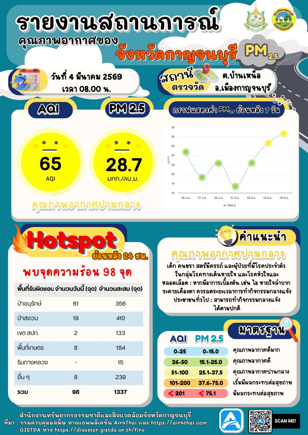ทั้งนี้ ปัจจุบันคุณภาพอากาศใน จ.กาญจนบุรี อยู่ในเกณฑ์ปานกลาง มีค่า PM2.5 อยู่ที่ 28.7 ไมโครกรัม/ลูกบาศก์เมตร ขณะที่ดาวเทียม Suomi NPP ตรวจพบจุดความร้อนในจังหวัดสูงถึง 98 จุด โดยส่วนใหญ่เกิดขึ้นในพื้นที่ป่าอนุรักษ์และพื้นที่เกษตร ซึ่งเป็นปัจจัยสำคัญที่ทำให้สถานการณ์ฝุ่นละอองยังคงต้องเฝ้าระวังอย่างใกล้ชิด