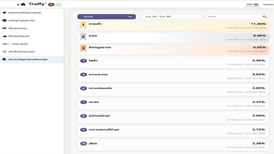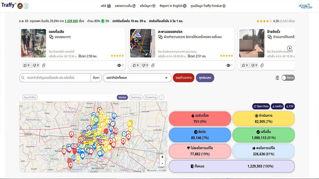 ในด้านความพึงพอใจ พบว่าประชาชนพึงพอใจการแก้ไข 326,636 เรื่อง (81%) และไม่พอใจ 77,882 เรื่อง (19%) ซึ่งข้อมูลทั้งหมดเปิดเผยแบบเรียลไทม์ สามารถติดตามสถานะได้ทุกขั้นตอน โดยสามารถดูสถิติได้ที่ https://bangkok.traffy.in.th/