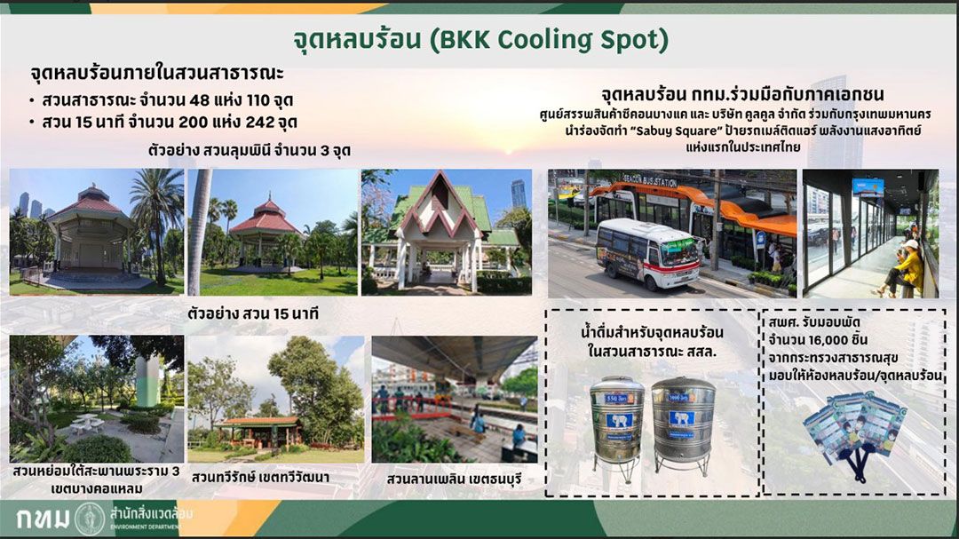 ประเทศไทยเข้าสู่ฤดูร้อนเมื่อวันที่ 22 ก.พ. 69 และคาดว่าฤดูร้อนจะสิ้นสุดประมาณกลางเดือนพฤษภาคม 69 สำนักสิ่งแวดล้อม ได้เตรียมความพร้อมสำหรับการบริหารจัดการความร้อนในพื้นที่กรุงเทพมหานคร โดยเตรียมจุดหลบร้อน (BKK Cooling Spot) สวนสาธารณะ 48 แห่ง 110 จุด สวน 15 นาที จำนวน 200 แห่ง 242 จุด ห้องหลบร้อน (BKK Cooling Center) ทั้งหมด 255 แห่ง แบ่งเป็นโรงเรียน 51 แห่ง โรงเรียนฝึกอาชีพ 10 แห่งศูนย์บริการสาธารณสุข 68 แห่ง ศูนย์บริการในสังกัดสำนักวัฒนธรรม กีฬา และการท่องเที่ยว76 แห่ง สำนักงานเขตทั้งหมด 50 แห่ง บริการน้ำดื่มสะอาด 2,806 จุด