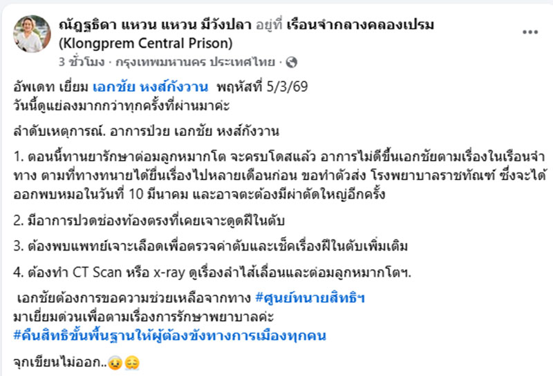 ความคืบหน้าล่าสุด น.ส.ณัฏฐธิดา มีวังปลา หรือแหวน โพสต์ข้อความผ่านเฟซบุ๊ก อัพเดท เยี่ยม เอกชัย หงส์กังวาน พฤหัสที่ 5/3/69