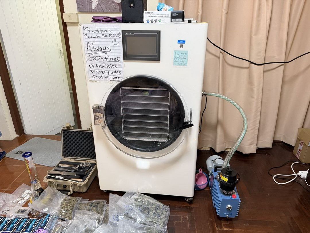 จากการตรวจสอบโดยละเอียด เจ้าหน้าที่สามารถตรวจยึดของกลางสำคัญ ได้แก่ กัญชาแห้ง บรรจุถุงพลาสติกพร้อมจำหน่าย 48 ถุง , ตู้อบแห้ง 1 เครื่อง และตู้แช่เย็น 1 ตู้ , ซองพลาสติกสีดำยี่ห้อ "YUMMY FROST" จำนวน 3 ลัง (ใช้สำหรับสร้างแบรนด์แบ่งขาย) และอุปกรณ์แปรรูปอื่นๆ รวมอีก 13 รายการ