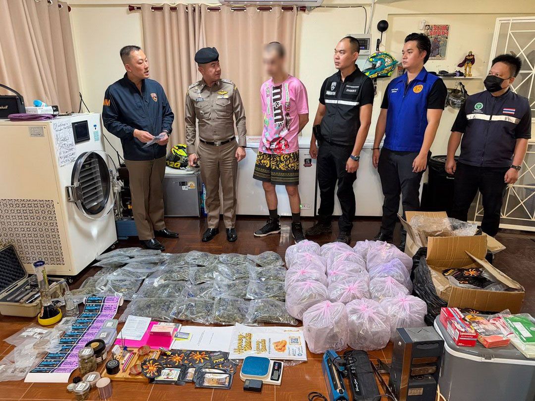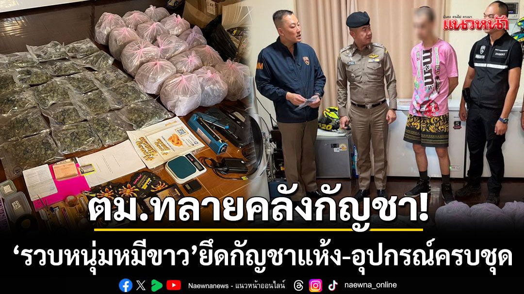 ทลายคลังกัญชาหนุ่มหมีขาว! ตม.3 ค้นบ้านย่านหนองปรือ ยึดกัญชาแห้ง 48 ถุง พร้อมอุปกรณ์แปรรูปครบชุด