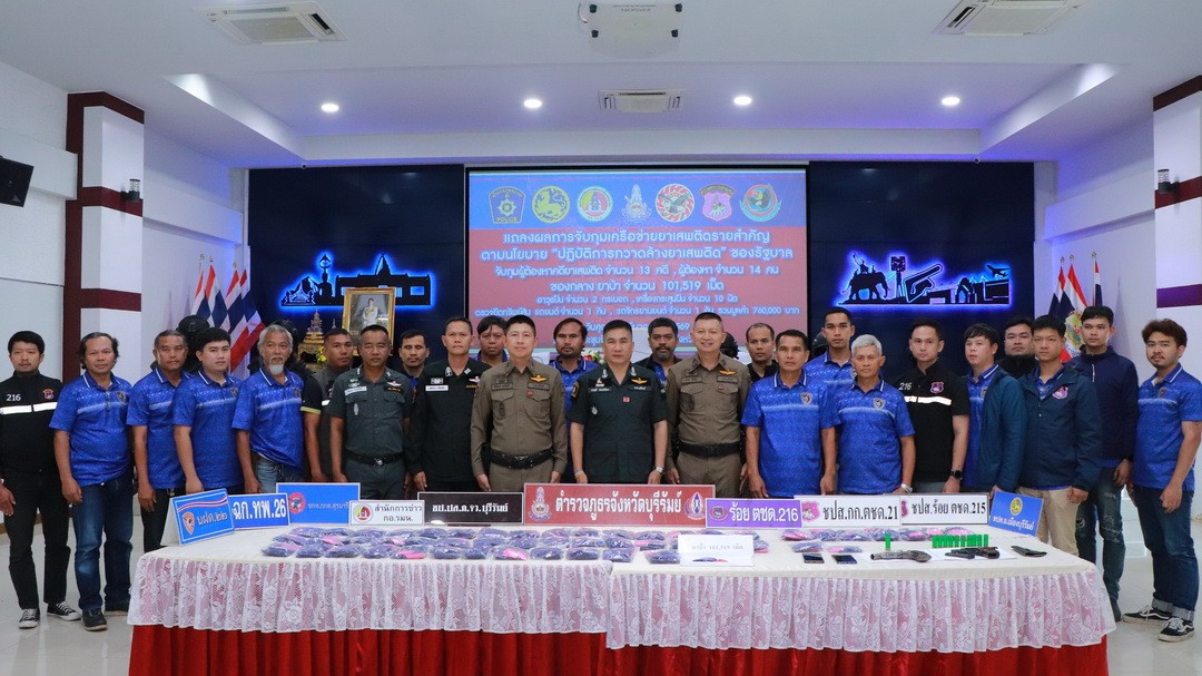 วันที่ 6 มี.ค. 69 ที่หอประชุมชัยจินดา ตำรวจภูธรจังหวัดบุรีรัมย์ พล.ต.ต.วรายุส์ จันทร์เยี่ยม ผบก.ภ.จว.บุรีรัมย์ พร้อมคณะ แถลงข่าวผลการจับกุมผู้ต้องหาคดียาเสพติดรายสำคัญตามนโยบาย ‘ปฏิบัติการกวาดล้างยาเสพติด’ โดยสามารถจับกุมได้ทั้งหมด 13 คดี ผู้ต้องหา 14 คน ยึดยาบ้ารวม 101,519 เม็ด อาวุธปืน 2 กระบอก และยึดทรัพย์สินรวมมูลค่ากว่า 760,000 บาท
