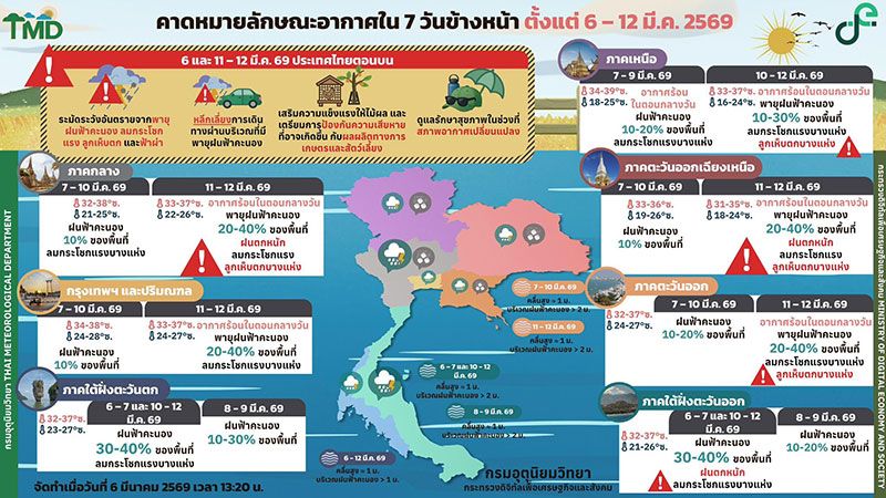 คาดหมายอากาศรายภาค 6 – 12 มีนาคม พ.ศ. 2569