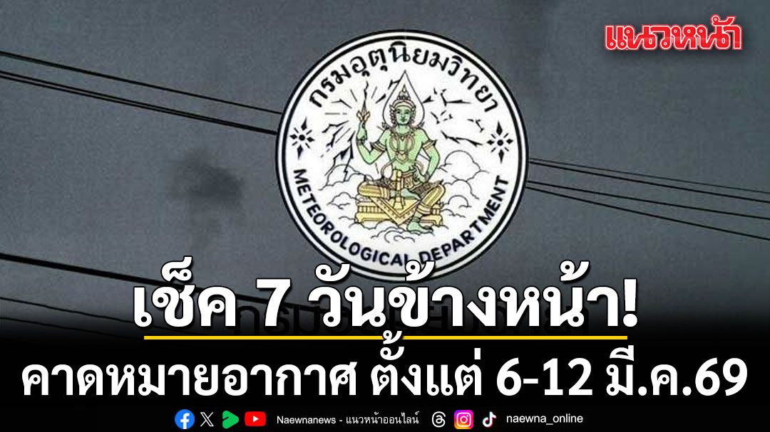 เมื่อเวลา 12.00 น. วันที่ 6 มีนาคม 2569 กรมอุตุนิยมวิทยา คาดหมายอากาศทั่วไป พยากรณ์อากาศ 7 วันข้างหน้า ระหว่างวันที่ 6 มีนาคม - 12 มีนาคม 2569 ดังนี้
