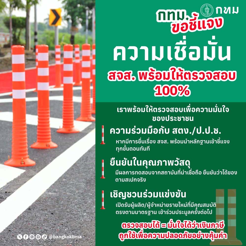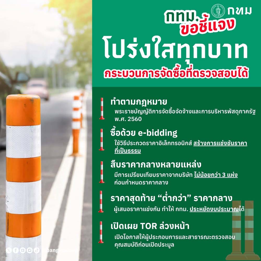 เพจกรุงเทพมหานครยังยืนยันว่าการจัดซื้อ โปร่งใสทุกบาท กระบวนการจัดซื้อที่ตรวจสอบได้ ทำตามกฎหมาย ซื้อด้วย e-bidding มีการสืบราคากลางหลายแหล่ง ราคาสุดท้าย "ต่ำกว่า" ราคากลาง มีการเปิดเผย TOR ล่วงหน้า พร้อมให้ตรวจสอบ 100% มั่นใจได้ว่าเงินภาษี ถูกใช้เพื่อความปลอดภัยอย่างคุ้มค่า