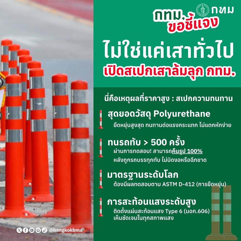 จัดระเบียบการจราจร คุ้มครองชีวิตประชาชน เหตุผลที่ราคาสูงเพราะไม่ใช่แค่เสาทั่วไป และมีความทนทาน สุดยอดวัสดุ Polyurethane ทนรถทับ > 500 ครั้ง มาตรฐานระดับโลก การสะท้อนแสงระดับสูง