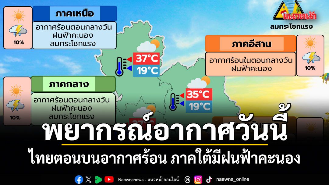 8 มีนาคม 2569 พยากรณ์อากาศประจำวัน ลักษณะอากาศทั่วไป พยากรณ์อากาศ 24 ชั่วโมงข้างหน้า ประเทศไทยตอนบนมีอากาศร้อนในตอนกลางวัน แต่ยังคงมีฝนฟ้าคะนองกับลมกระโชกแรงเกิดขึ้นได้บางพื้นที่ เนื่องจากความกดอากาศต่ำเนื่องจากความร้อนปกคลุมประเทศไทยตอนบน ประกอบกับมีลมใต้และลมตะวันออกเฉียงใต้พัดนำความชื้นจากทะเลจีนใต้และอ่าวไทยเข้ามาปกคลุมประเทศไทยตอนบน ในขณะที่ประเทศไทยตอนบนมีอากาศร้อน ขอให้ประชาชนในบริเวณดังกล่าวระวังอันตรายจากฝนฟ้าคะนอง และลมกระโชกแรงไว้ด้วย