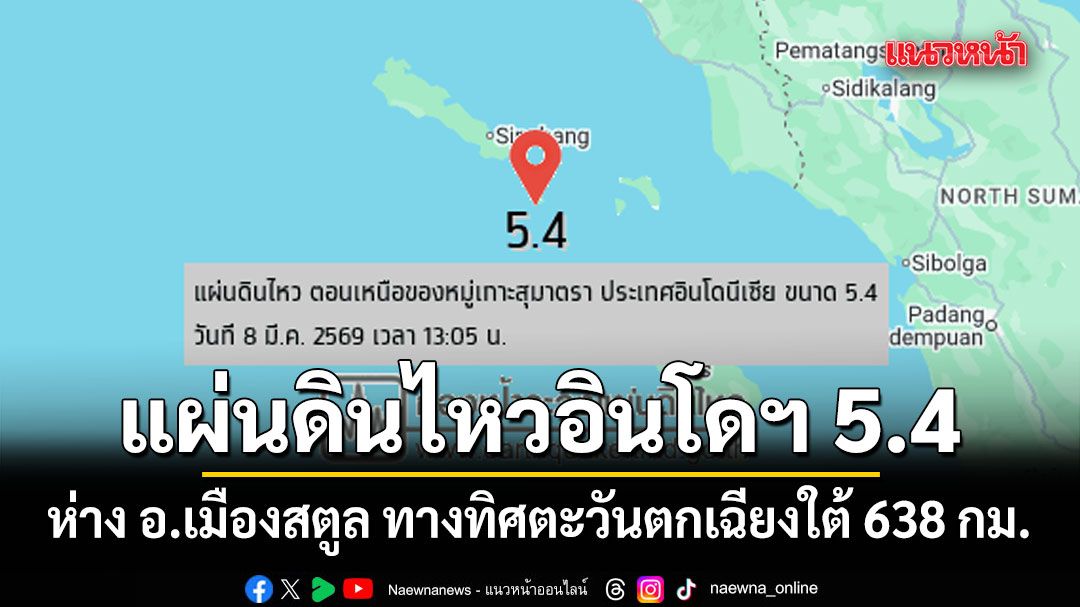 เมื่อวันที่ 8 มี.ค.2569 เพจกรมอุตุนิยมวิทยา รายงานการเกิดแผ่นดินไหว เวลา 13:05 น. ตอนเหนือของหมู่เกาะสุมาตรา ประเทศอินโดนีเซีย (2.068N,96.631E) ขนาด 5.4 ทางทิศตะวันตกเฉียงใต้ของ อ.เมือง จ.สตูล ประมาณ 638 กม.