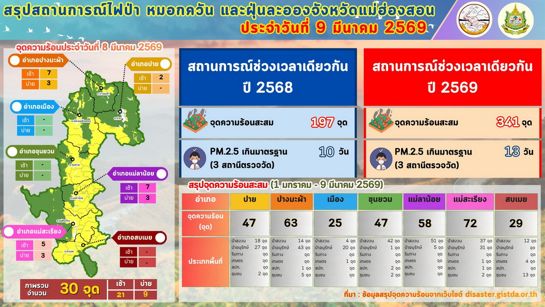 จากการเปรียบเทียบข้อมูลในห้วงเวลาเดียวกัน พบว่าในปี 2568 มีจุดความร้อนสะสม 197 จุด แต่ในปี 2569 นี้ พุ่งสูงถึง 341 จุด (ต่างกัน 144 จุด) เช่นเดียวกับสถานการณ์ฝุ่นละอองขนาดเล็กที่ปีนี้มีจำนวนวันที่ค่า PM 2.5 เกินมาตรฐานสูงถึง 13 วัน (มากกว่าปีก่อนที่เกินมาตรฐานเพียง 10 วัน) สะท้อนถึงวิกฤตไฟป่าที่ทวีความรุนแรงขึ้น