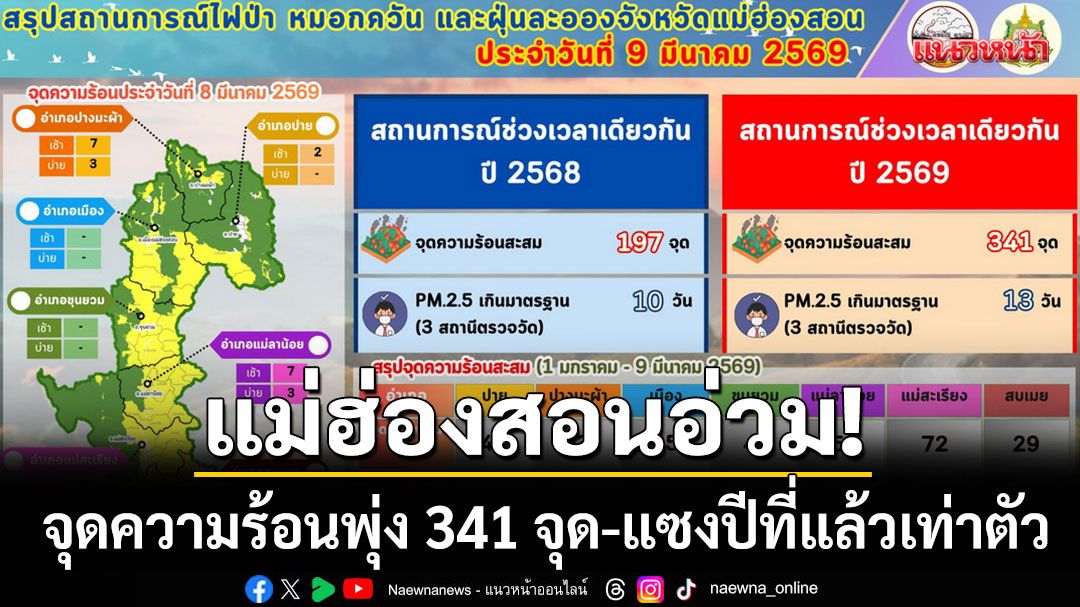 แม่ฮ่องสอนอ่วม! จุดความร้อนพุ่ง 341 จุด แซงปีที่แล้วเท่าตัว ผู้ว่าฯ สั่ง 7 อำเภอยกระดับมาตรการเชิงรุกสกัดไฟป่า