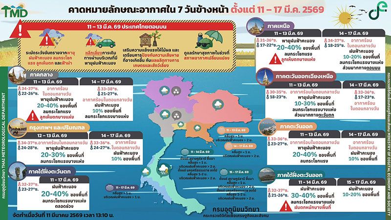 ในช่วงวันที่ 12 – 13 มี.ค. 69 มีพายุฝนฟ้าคะนองร้อยละ 20 - 40 ของพื้นที่ กับมีลมกระโชกแรงและลูกเห็บตกบางแห่งอุณหภูมิต่ำสุด 17 – 22 องศาเซลเซียส อุณหภูมิสูงสุด 31 – 36 องศาเซลเซียสลมตะวันออกเฉียงใต้ ความเร็ว 10 - 15 กม./ชม.ส่วนในช่วงวันที่ 14 - 18 มี.ค. 69 อากาศร้อนในตอนกลางวัน โดยมีฝนฟ้าคะนองร้อยละ 10 – 20 ของพื้นที่ และมีลมกระโชกแรงบางแห่ง ส่วนมากทางตอนบนอุณหภูมิต่ำสุด 18 – 25 องศาเซลเซียส อุณหภูมิสูงสุด 34 – 37 องศาเซลเซียสลมตะวันออกเฉียงใต้ ความเร็ว 5 - 15 กม./ชม.