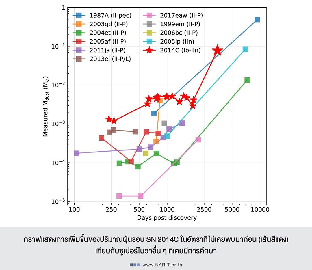 สถาบันวิจัยดาราศาสตร์แห่งชาติ (องค์การมหาชน) (สดร. หรือ NARIT) เผย ดร.สมาพร ติญญนนท์ นักวิจัย NARIT ใช้กล้องโทรทรรศน์อวกาศเจมส์ เว็บบ์ (JWST) ติดตามการระเบิดของซูเปอร์โนวา 2014C พบการก่อตัวของปริมาณฝุ่นที่เพิ่มขึ้นในอัตราสูงผิดปกติ ขยายขอบเขตความเข้าใจในปัจจุบันเกี่ยวกับการเกิดฝุ่นของซูเปอร์โนวา เผยให้เห็นถึงกระบวนการใหม่ที่ยังไม่เคยค้นพบมาก่อน และอาจนำไปสู่การไขปริศนาต้นกำเนิดธาตุบนโลก งานวิจัยดังกล่าวตีพิมพ์ลงในวารสาร Astrophysical Journal