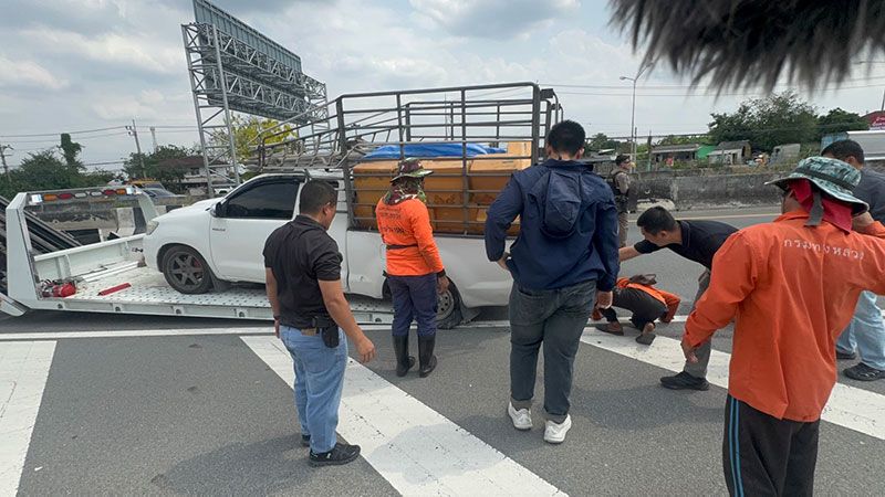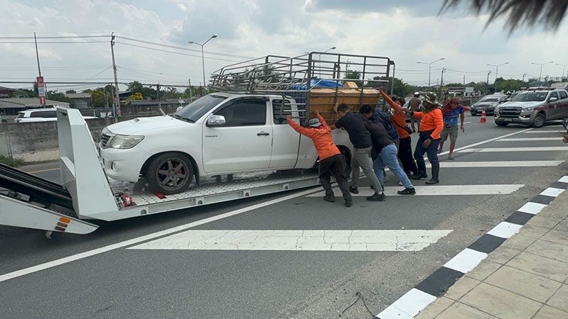 โดยรถกระบะอยู่ในสภาพยางด้านซ้ายล้อหลังแตก จอดอยู่บนไหล่ทาง โดยมี นายอิสละ หรือมิค อายุ 28 ปี เป็นคนขับ จึงนำรถยกเข้ามาที่ สภ.บางบัวทอง เพื่อทำการตรวจค้น