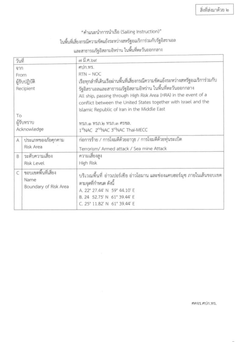 14 มีนาคม 2569 พลเรือตรี ปารัช รัตนไชยพันธ์ โฆษกกองทัพเรือ เปิดเผยว่า กองทัพเรือ โดยศูนย์ควบคุมการจราจรทางทะเล ศูนย์ปฏิบัติการกองทัพเรือ (ศคจร.ศปก.ทร.) ได้ออกประกาศแจ้งเตือนสถานการณ์ความมั่นคงทางทะเลเพิ่มเติม ลงวันที่ 13 มีนาคม 2569 เพื่อแจ้งเตือนผู้ประกอบการเดินเรือและเรือพาณิชย์ไทย ให้เพิ่มความระมัดระวังในการเดินเรือในพื้นที่ อ่าวเปอร์เซีย อ่าวโอมาน และช่องแคบฮอร์มุซ ภายหลังสถานการณ์ความตึงเครียดในภูมิภาคมีแนวโน้มเพิ่มสูงขึ้น