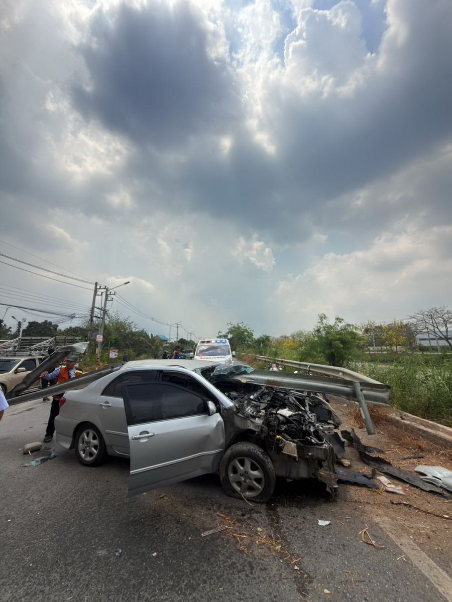 วันที่ 17 มี.ค. 69 ร.ต.ท.อนุสรณ์ เวียงสิมา รองสารวัตร (สอบสวน) สภ.คลองหลวง ได้รับแจ้งเหตุอุบัติเหตุรถยนต์เก๋งเสียหลักพุ่งชนการ์ดเลนเหล็กข้างทาง มีผู้เสียชีวิตติดภายในรถ บริเวณถนนเลียบคลองระพีพัฒน์ ใกล้ซอยเอราวัณ 38 ต.คลองสอง อ.คลองหลวง จ.ปทุมธานี จึงรุดไปตรวจสอบพร้อมทีมกู้ชีพเทศบาลเมืองท่าโขลง และอาสาสมัครมูลนิธิร่วมกตัญญู