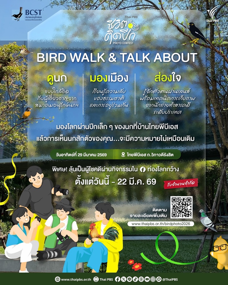 ไทยพีบีเอส จับมือ BCST จัดประกวดภาพนก “Thai PBS ชีวิตติดปีก Photo Contest” ร่วมถ่ายทอดเรื่องราวของนกไทยผ่านภาพถ่ายและคลิปวิดีโอ ชิงเงินรางวัลรวมกว่า 200,000 บาท เปิดรับผลงาน 29 มี.ค. – 31 พ.ค. นี้ พร้อมจัดกิจกรรมพิเศษ “Bird Walk & Talk About ดูนก | มองเมือง | ส่องใจ” ชวนเรียนรู้ธรรมชาติและเทคนิคถ่ายภาพจากผู้เชี่ยวชาญ