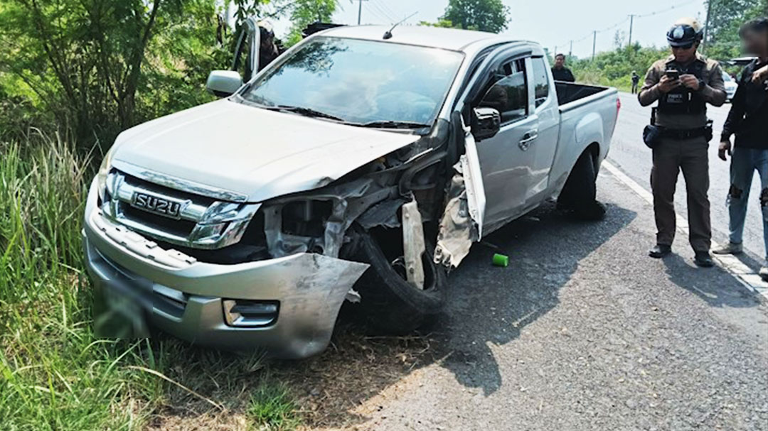 ในที่เกิดเหตุพบรถกระบะ ISUZU D-MAX สีบรอนซ์เงิน ทะเบียน กทม. สภาพซีกซ้ายพังเสียหายยับเยินจากการกระแทกต้นไม้ริมไหล่ทางอย่างแรง อย่างไรก็ตามเจ้าหน้าที่กลับไม่พบผู้ได้รับบาดเจ็บหรือคนขับอยู่ในบริเวณดังกล่าว ต่อมาได้รับแจ้งเบาะแสสำคัญจากชาวบ้านว่า เห็นชายคนขับออกมาจากรถในท่าทางมีพิรุธ ก่อนจะโบกรถกระบะสีดำของชาวบ้านมุ่งหน้าเข้าไปในตัวอำเภอสังขะ