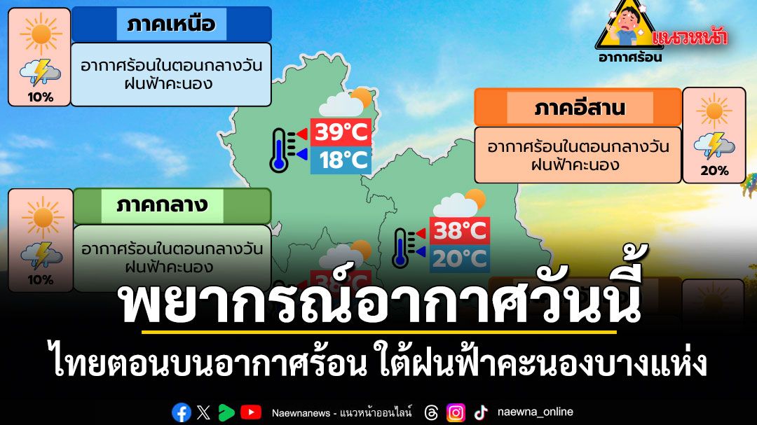 20 มีนาคม 2569 พยากรณ์อากาศประจำวัน ลักษณะอากาศทั่วไป พยากรณ์อากาศ 24 ชั่วโมงข้างหน้า ประเทศไทยตอนบนมีอากาศร้อนในตอนกลางวัน แต่ยังคงมีฝนฟ้าคะนองบางแห่ง ส่วนมากบริเวณภาคเหนือตอนล่าง ภาคตะวันออกเฉียงเหนือตอนล่าง ภาคกลาง และภาคตะวันออก เนื่องจากความกดอากาศต่ำเนื่องจากความร้อนปกคลุมประเทศไทยตอนบน ในขณะที่มีลมใต้และลมตะวันออกเฉียงใต้พัดนำความชื้นจากทะเลจีนใต้และอ่าวไทยเข้ามาปกคลุมบริเวณประเทศไทยตอนบน ขอให้ประชาชนบริเวณประเทศไทยตอนบนดูแลรักษาสุขภาพ เนื่องจากสภาพอากาศที่ร้อน และระวังอันตรายจากฝนฟ้าคะนอง