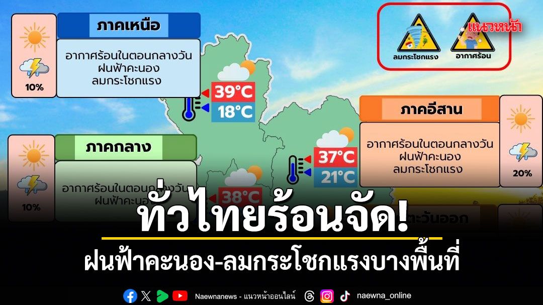 22 มีนาคม 2569 พยากรณ์อากาศประจำวัน ลักษณะอากาศทั่วไป พยากรณ์อากาศ 24 ชั่วโมงข้างหน้า ประเทศไทยตอนบนมีอากาศร้อนในตอนกลางวัน โดยมีฝนฟ้าคะนองกับลมกระโชกแรงบางแห่ง เนื่องจากความกดอากาศต่ำเนื่องจากความร้อนปกคลุมประเทศไทยตอนบน ในขณะที่มีลมใต้และลมตะวันออกเฉียงใต้พัดปกคลุมในบริเวณดังกล่าว ขอให้ประชาชนบริเวณประเทศไทยตอนบนดูแลรักษาสุขภาพเนื่องจากสภาพอากาศที่ร้อน และระวังอันตรายจากฝนฟ้าคะนองกับลมกระโชกแรงที่อาจเกิดขึ้นได้ในบางพื้นที่