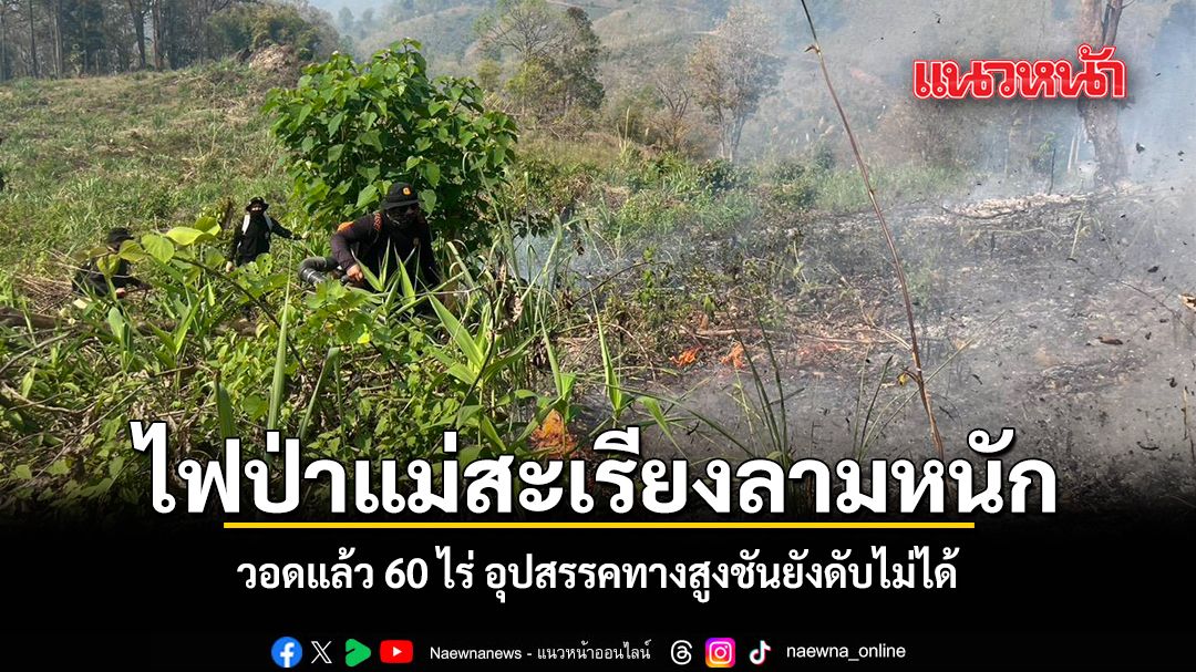 หน่วยป้องกันรักษาป่าที่ มส.5 (แม่สะเรียง) นำกำลังเข้าดับไฟป่าบริเวณพื้นที่ป่าบ้านขุนแม่ต้อบ หมู่ 5 ต.บ้านกาศ อ.แม่สะเรียง จ.แม่ฮ่องสอน ยังไม่สามารถดับไฟป่าได้เนื่องจากภูมิประเทศเป็นภูเขาสูงชัน พบพื้นที่ป่าเสียหายไปกว่า 60 ไร